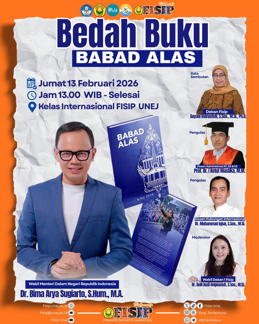 FISIP UNEJ menghadirkan kegiatan bedah buku Babad Alas karya Dr. Bima Arya Sugiarto, S.Hum., M.A. (Wakil Menteri Dalam Negeri Republik Indonesia).