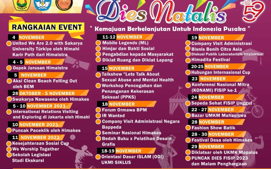 Dekan FISIP Universitas Jember, Dr. Djoko Poernomo, M.Si., CIQnR, CSBA., menyatakan “Berbagai rangkaian event dalam mendukung semarak Dies Natalis FISIP Universitas Jember ke-59 sepenuhnya diperuntukan bagi pengembangan potensi dan bakat mahasiswa aktif serta alumni”. Djoko juga menambahkan bahwa esensi dalam rangkaian kegiatan Dies Natalis FISIP Universitas Jember ke-59 Tahun 2023 diharapkan membawa manfaat optimal bagi para mahasiswa”.