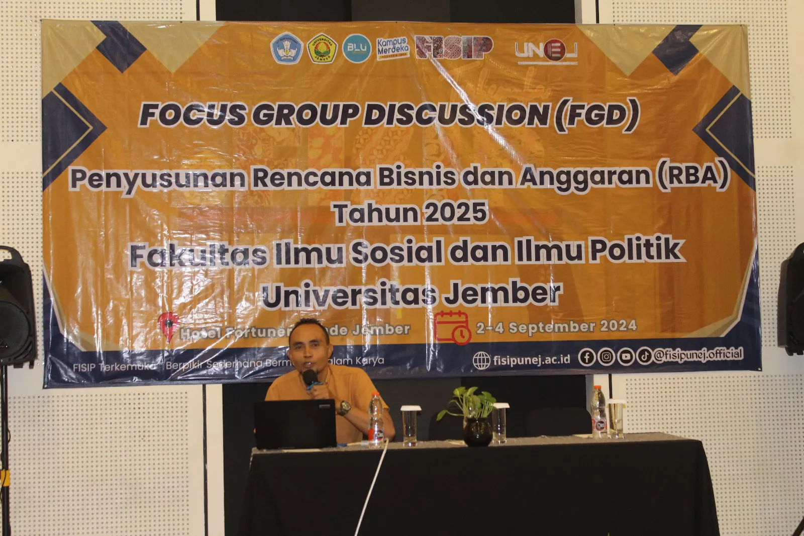 FGD Penyusunan Rencana Bisnis dan Anggaran (RBA) Tahun 2025 di selenggrakan di Hotel Fortunergrande Jember mulai tanggal 2 sampai 4 September 2024. di hadiri oleh Kajur/kaprodi termasuk Kalab FISIP Universitas Jember. acara diawali oleh sambutan PIC yaitu Wadel Dekan bidang keuangan dan umum Drs Joko Mulyono, M.Si dan dibuka oleh Dekan FISIP Universitas Jember Dr. Djoko Poernomo, M.Si