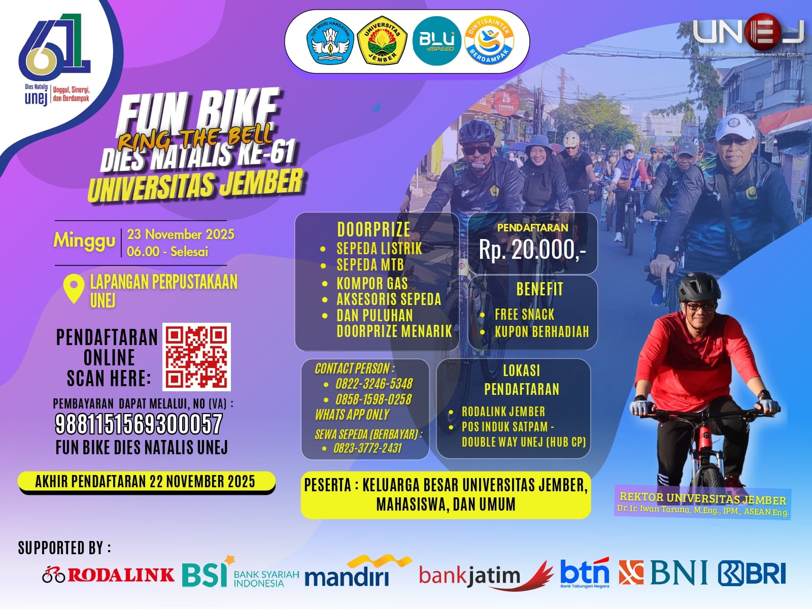 Kesuksesan Fun Bike Dies Natalis ke-61 Unej tidak terlepas dari dukungan kuat yang diberikan oleh berbagai pihak sponsor utama. Sejumlah bank dan perusahaan terkemuka turut menyemarakkan acara ini, memberikan kontribusi signifikan mulai dari penyediaan doorprize menarik hingga fasilitas penunjang lainnya. Para sponsor utama yang terlibat adalah Roda Link, BSI Syariah, Bank Mandiri, Bank Jatim, BTN, Bank BNI, dan Bank BRI. Dukungan ini menegaskan sinergi positif antara Unej sebagai institusi pendidikan dengan dunia usaha dan industri perbankan di Indonesia.