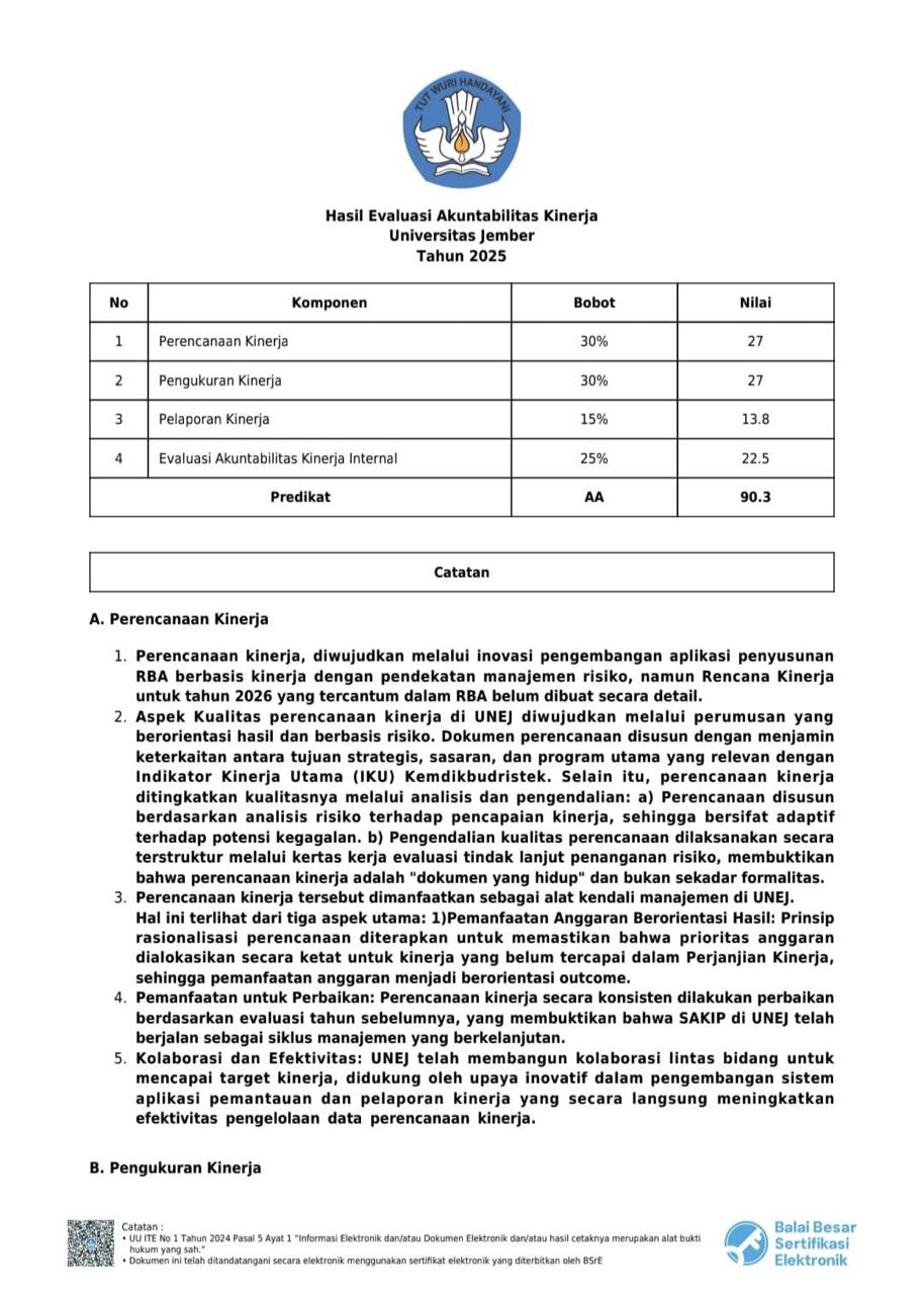 Predikat AA menunjukkan bahwa Universitas Jember telah berhasil mengintegrasikan sistem perencanaan kinerja, pengukuran kinerja, pelaporan kinerja dan evaluasi akuntabilitas kinerja internal, dengan total poin mencapai 90.3. Kemendiktisaintek menilai bahwa setiap rupiah yang dikeluarkan oleh universitas memiliki korelasi langsung terhadap hasil atau output yang bermanfaat bagi masyarakat dan pengembangan ilmu pengetahuan. Tidak hanya sekadar penyerapan anggaran, UNEJ dinilai sukses melakukan efisiensi birokrasi dan fokus pada program-program strategis yang berdampak nyata pada kualitas lulusan dan penelitian.