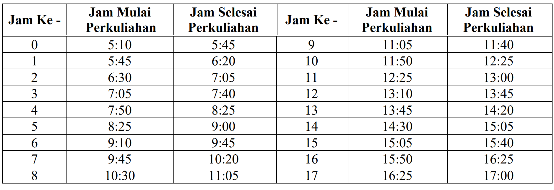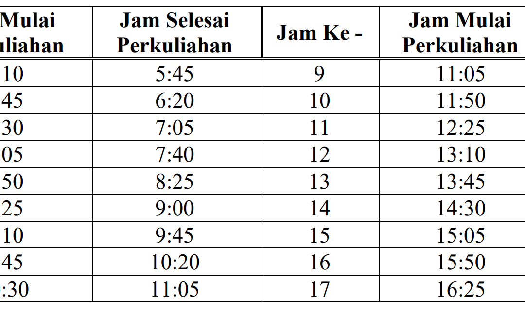 Dalam surat edaran terbaru, durasi satu satuan kredit semester (SKS) yang biasanya berlangsung selama 50 menit, kini dipangkas menjadi 35 menit. Hal ini mengakibatkan waktu berakhirnya kelas di sore hari menjadi lebih awal dari biasanya. Penyesuaian ini bertujuan agar para mahasiswa dan tenaga pengajar memiliki waktu yang cukup untuk melakukan perjalanan pulang dan mempersiapkan momen berbuka puasa bersama keluarga di rumah masing-masing.